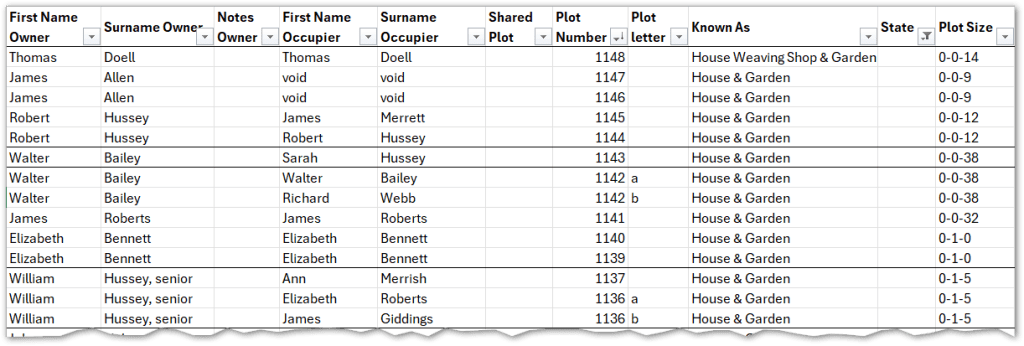 Searching for just one of the names from the 1841 census gave me that elusive ‘eureka’ moment. Suddenly, I had a way of assigning a plot number to a family, since I now had the name of the owner, and – most importantly – the name of the occupier.