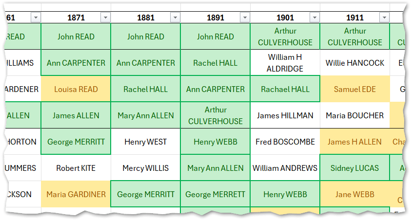 - There were a lot of repeated family names – in addition to the snippet above, the whole list of between twenty-nine and thirty-two households was almost completely green or yellow, and uncoloured cells were in the minority.